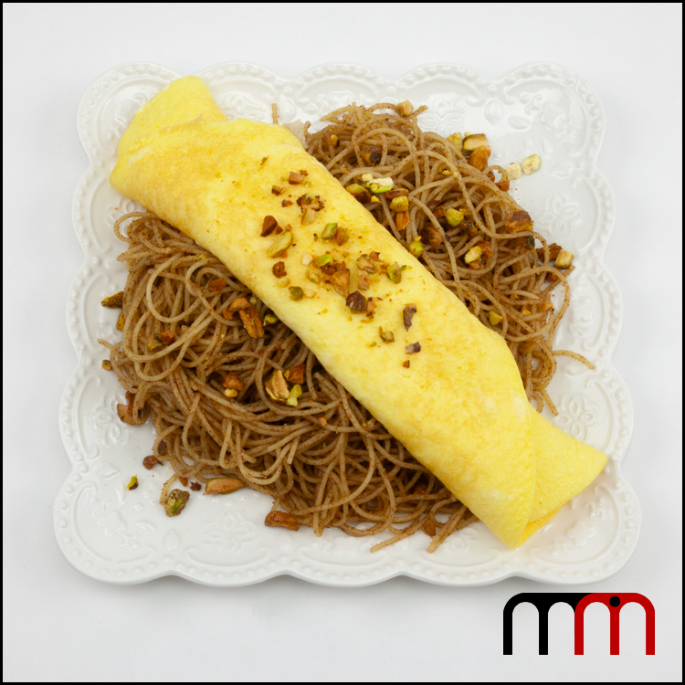 Serve the vermicelli with the omelette on top and sprinkle with crushed pistachios.