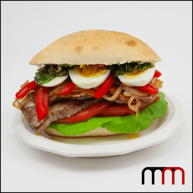 This is no simple steak sandwich, it’s a lesson in sandwich mastery. This is breakfast, lunch and dinner all rolled up into one amazing sandwich. And its good for you too, look at all those vegetables! I never thought a steak sandwich could feel healthy, but I was wrong, oh so delightfully wrong. From the salty, savory steak to the creamy egg yolks and pancetta, delicious sweet red peppers and fried onions topped with the amazingly fresh chimichurri salsa, all on a bed of lovely lettuce and tomatoes. And then that bread, oh that sweet delicious Portuguese bread. I was fortunate to have access to Portuguese sandwich rolls in my area and I urge you to try to find them, my wife Suzy always makes sure she has a stash of some on hand. This is a five star Suzy rated sandwich, I truly hope you will give it a try.